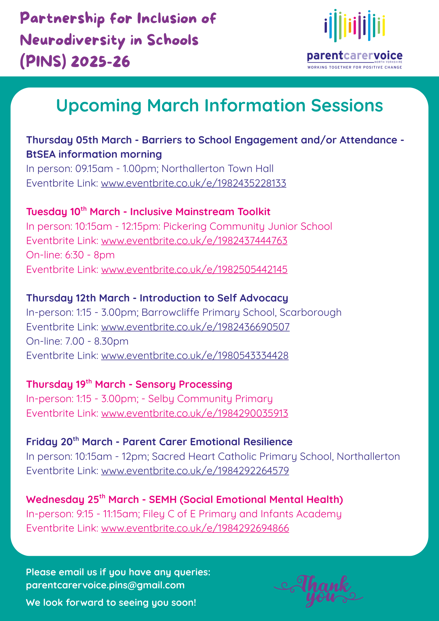 We now have a plan in place for the information sessions we will be offering from the end of November up to the end of March 2026. (These are separate to the additional sessions provided by the main PINS programme for schools which we'll be notifying you about on a separate email before half-term.)