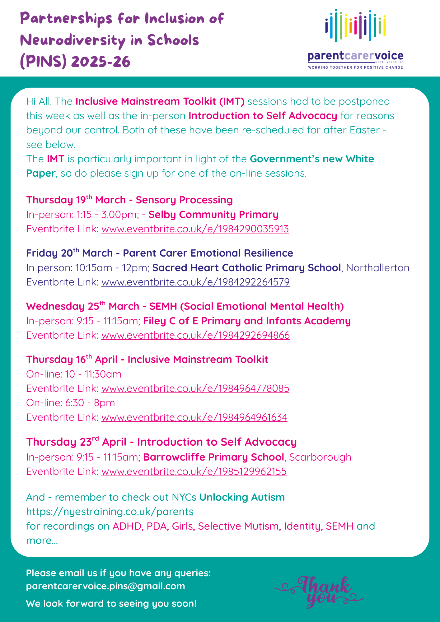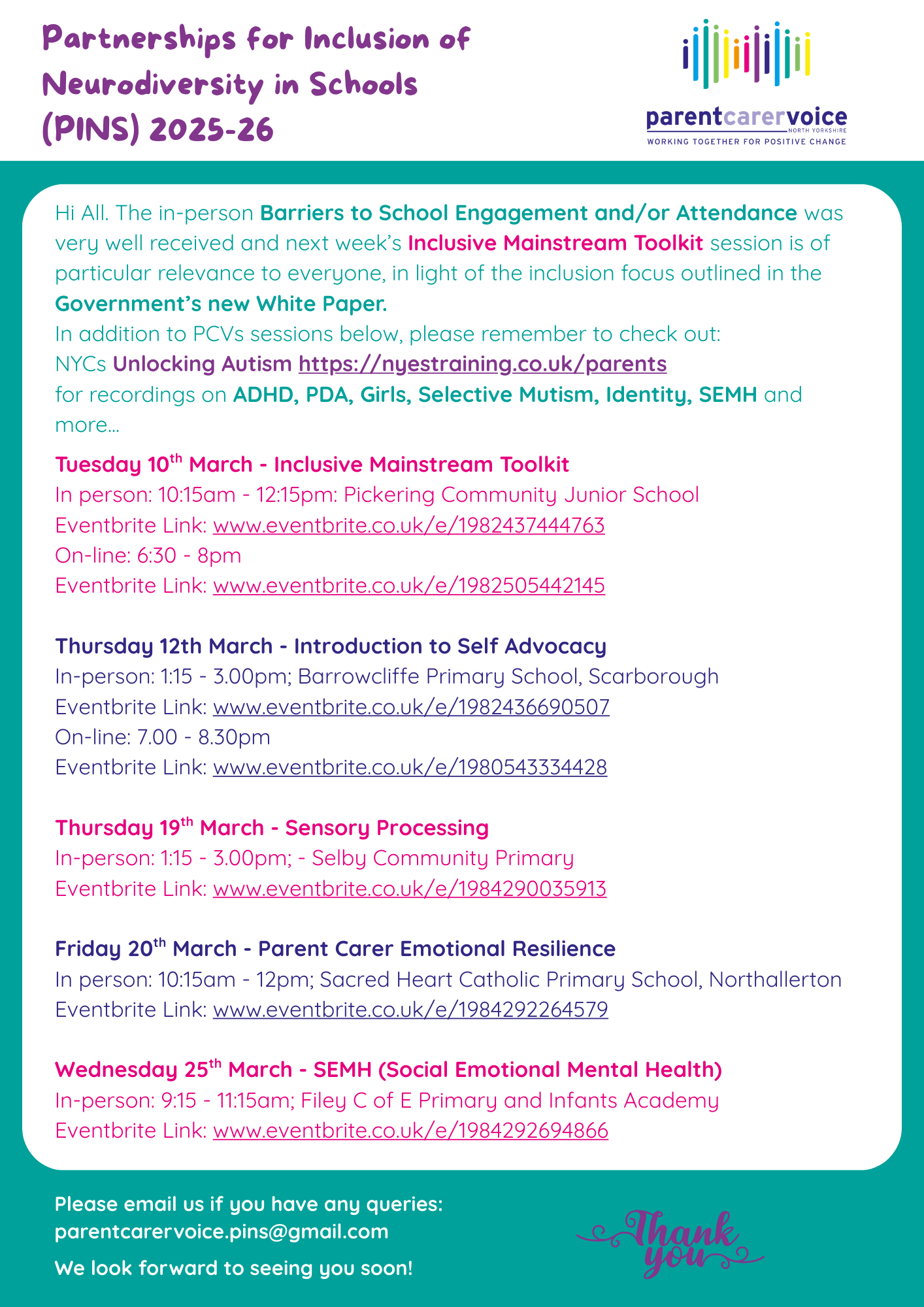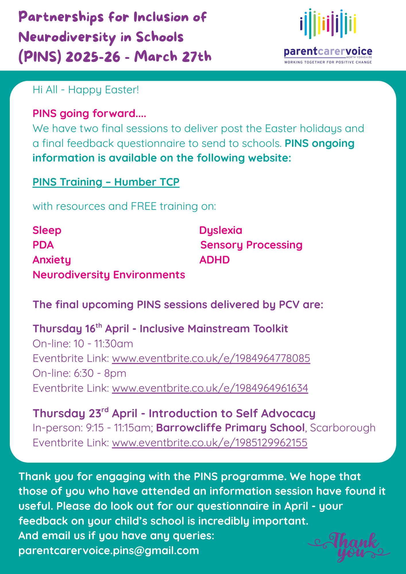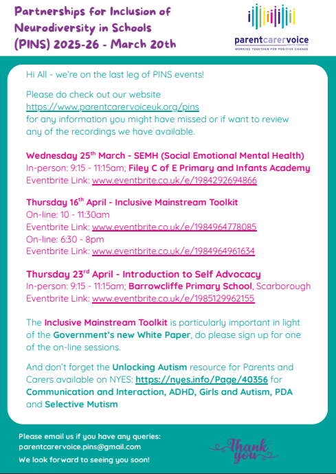 We're fast approaching the end of the year and have almost confirmed all the dates for the PINS parent carer information sessions for next term as well as the online sessions.