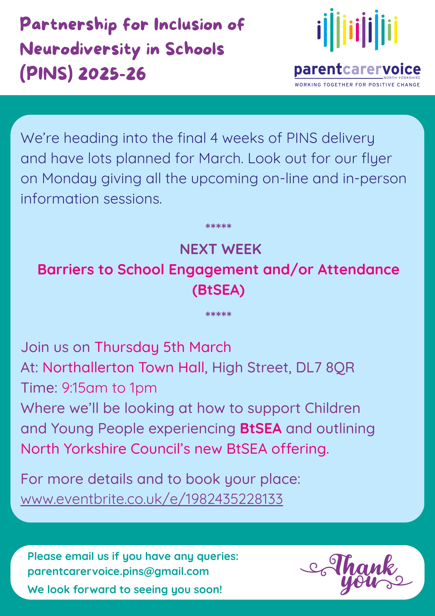 And North Yorkshire schools have been offered additional in-person training on more generic neurodiverse awareness & classroom support and Barriers to School Engagement and /or Attendance, in line with Parent Carer Voice's own Parents/Carers offering.